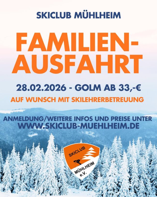 Familien Ausfahrt zum Erlebnisberg Golm 28. Februar 2026 Am 28.02.2026 veranstalten wir eine Familien-Ausfahrt mit dem Bus zum Erlebnisberg Golm im Montafon. Abfahrt ist um 5:50 Uhr an der Realschule, Mühlheim. Am Erlebnisberg Golm erwarten dich neun moderne Liftanlagen mit 44 perfekt präparierten Pistenkilometern und Skipisten für jedes Fahrkönnen – schneesicher dank moderner Beschneiungsanlagen. Somit…